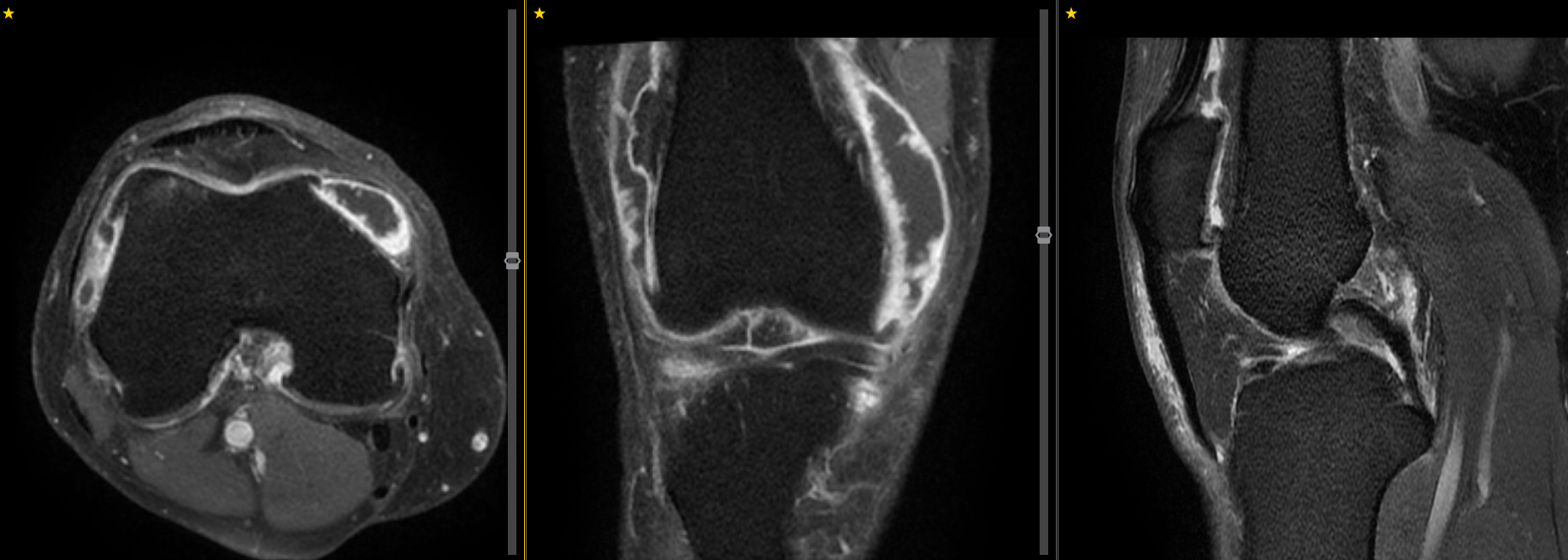 MRI demonstrate marked synovial hyperenhancement in a patient with knee osteoarthritis. A great target for TAME.