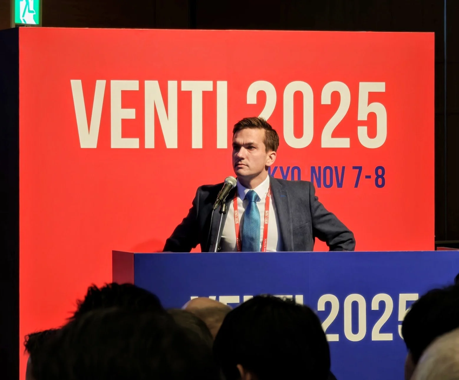Dr Ross Copping presenting on trans-pedal genicular artery embolisation at VENTI 2025